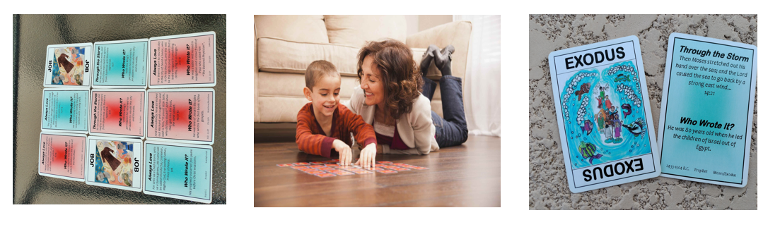 “Mom! Do you have any Exodus?” Parents can help little ones begin to know the Bible through hearing pronunciations, seeing the pictures, and hearing the stories that the Bible Go Fish, Bible Match, and Bible Spoons games encourage.