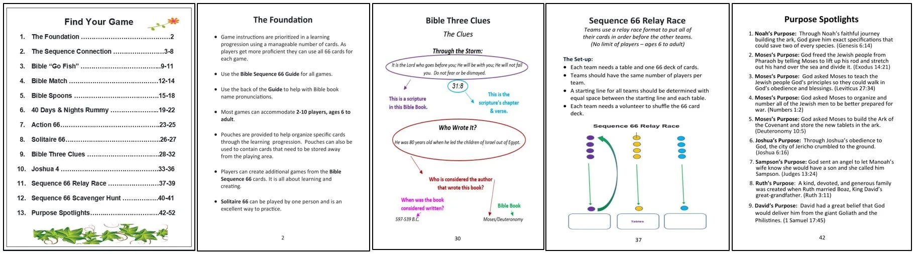 The Bible Sequence 66 Quick Start Booklet provides learning adventures to help participants find the games they want to play and how to find a scripture, chapter, verse, author, and timeline. The Purpose Spotlight shines a light on the people that helped write the Bible, through God’s divine intervention.
